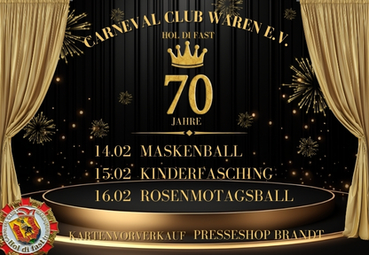 Seit Jahrzehnten gehört der CCW fest zum kulturellen Leben in Waren (Müritz). Mit viel ehrenamtlichem Engagement, kreativen Programmen und großer Leidenschaft sorgt der Verein Jahr für Jahr für Stimmung, Gemeinschaft und unvergessliche Momente. Die 70. Session ist dabei ein Meilenstein, der gebührend gefeiert wird. Ein Höhepunkt der Session wird die große Geburtstagsparty am 14. Februar 2026 im beheizten Festzelt am Amtsbrink sein. Unter dem Motto „70 Jahre Karneval in Waren“ erwartet die Besucherinnen und Besucher ein Abend voller Musik, Tanz und karnevalistischer Stimmung. Der Carneval Club Waren e.V. steht nicht nur für närrische Unterhaltung, sondern auch für Zusammenhalt und Nachwuchsarbeit. Neben der Session engagiert sich der Verein auch außerhalb der Karnevalszeit, unter anderem mit Projekten wie dem vereinsinternen Sommercamp, das besonders Kindern und Jugendlichen Gemeinschaft und Vereinsleben näherbringt. Karten für die Veranstaltungen sind im Vorverkauf erhältlich, unter anderem beim Presseshop Brandt auf dem Neuen Markt.