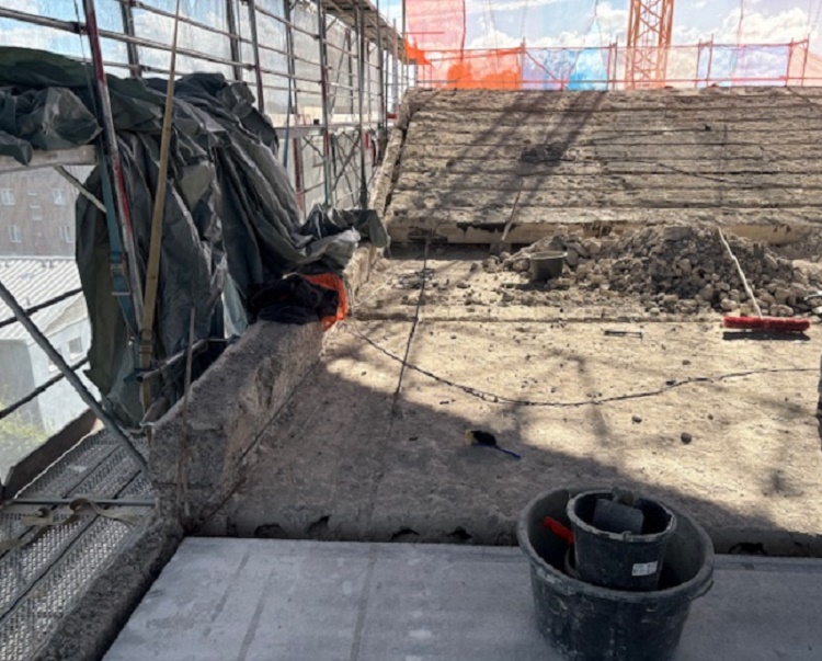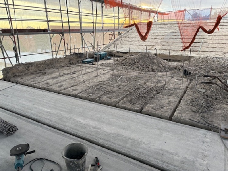 Die Abrucharbeiten an den Sheddächern auf dem Würfelteil sind abgeschlossen und die neuen Deckenplatten für die Aufstockung sind gelegt. Nun wird das Treppenauge und ein Teil der Wände aus Beton hergestellt.