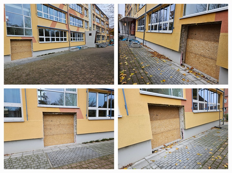 - Herstellung der neuen Ausgänge aus den Treppenhäusern auf der Seite des Schulhofes