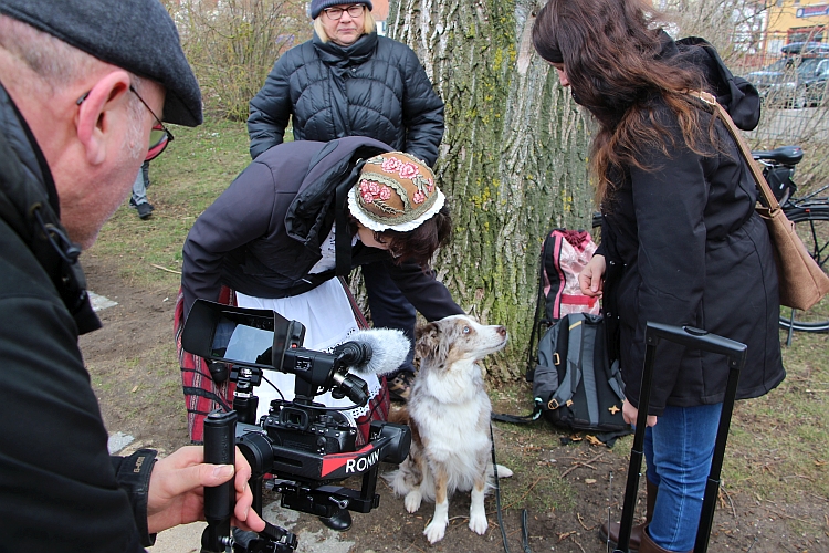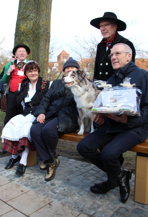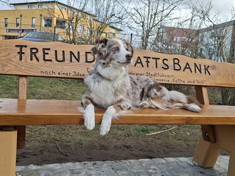 Natürlich wurde bei der Filmproduktion, der Bavaria Fiction GmbH im Vorfeld angefragt, ob der Nachbau einer Requisite im Stadtgebiet einen Platz finden kann. Gerne wurde zugestimmt, aber nur wenn Vertreter der Crew dabei sein dürften! So kam eine ganze Delegation an die Müritz und genoss neben der großen Aufmerksamkeit, die ihnen die Warenerinnen und Warenern entgegenbrachten, besonders den wunderbaren Ausblick auf die Binnenmüritz. (siehe Foto vorne links: Stadtführerin und Initiatorin Petra Hakert, Regisseur Oliver Liliensiek, Australian Shepherd Hoonah alias „Käthe“ und Schauspielerin Hildegard Schroedter auf der Freundschaftbank. Dahinter Hundetrainerin Caroline Zeidler, Stadtführer Klaus Lambrecht und Produzent Felix Türcke)
