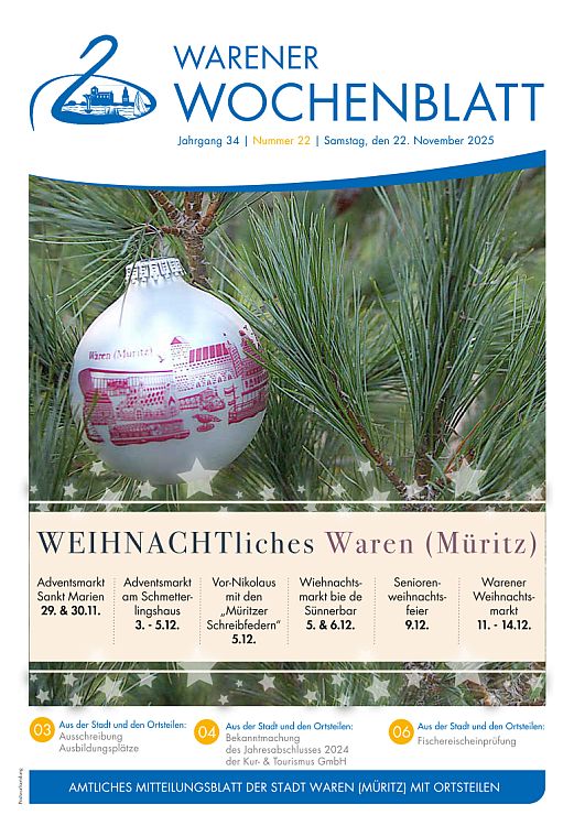 Die Nr. 22 des Warener Wochenblattes enthält die Ausschreibung der Ausbildungsplätze, die Bekanntmachung des Jahresabschlusses 2024 der Kur- & Tourismus GmbH sowie Hinweise zur nächsten Fischereischeinprüfung.