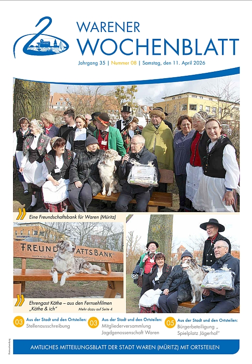 Die Nr. 8 des Warener Wochenblattes beinhaltet eine Stellenausschreibung, Hinweise der Warener Jagdgenossenschaft zur Mitgliederversammlung sowie einen Beitrag zur Warener Freundschaftsbank.