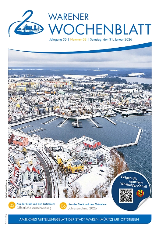 Die Nr. 3 des Warener Wochenblattes enthält eine öffentliche Ausschreibung, einen Bericht zum Jahresempfang sowie Informationen Widerspruchsrechte gegen die Datenübermittlung nach dem Bundesmeldegesetz (BMG)