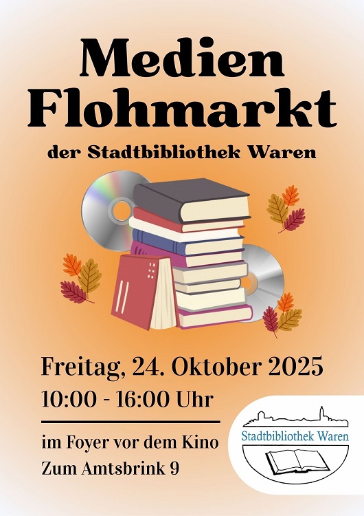 Die Stadtbibliothek Waren (Müritz) veranstaltet am Freitag, den 24. Oktober 2025, von 10:00 bis 16:00 Uhr einen großen Flohmarkt „vor den Toren“ der Stadtbibliothek, im Foyer des Bürgerhauses, vor dem CineStar-Kino (Zum Amtsbrink 9, 17192 Waren).