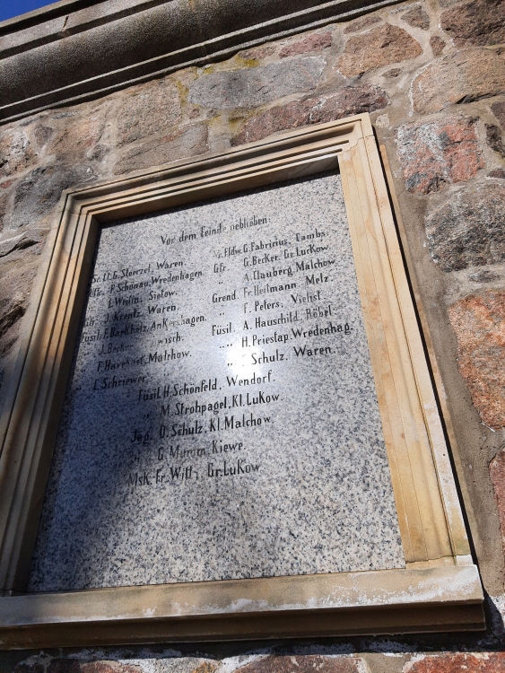 Die Einweihung des Ehrenmals am Kietz für alle 432 Gefallenen der Stadt Waren im Ersten Weltkrieg fand erst am 26.6.1932 mit einem großem Festakt unter Teilnahme einer Reichswehrabordnung statt. Nachmittags schloß sich ein dreistündiges Militärkonzert der 30 Mann starken Kurkapelle unter Leitung von Richard Müller an.