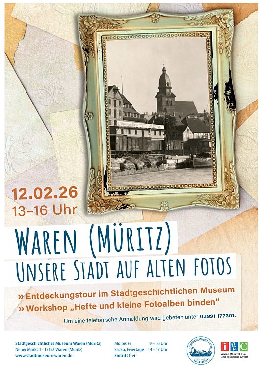 Zum Feriennachmittag lädt das Stadtgeschichtliche Museum Waren (Müritz) am 12. Februar 2026 ein. Ab 13 Uhr geht es auf Entdeckungstour durch die Ausstellung – wie sah Waren früher aus? Und wie wurden die Aufnahmen damals gemacht? Auf einem kleinen Rundgang seht ihr viele verschiedene Ansichten unserer Stadt und könnt euch eine alte Plattenkamera näher anschauen. In einem Workshop mit Tanja Blaufuß entstehen feine Hefte und kleine Fotoalben. (Für Kinder ab 6 Jahren. Um eine telefonische Anmeldung wird gebeten unter 03991 177351.)