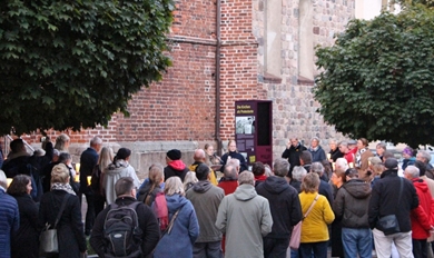 Weg der Kerzen: St.-Georgen-Kirche / zentrales Erinnerungszeichen – Neuer Markt – St.-Marien-Kirche mit Vorstellung der Inhalte der Tafeln der Freiluftausstellung zur Friedlichen Revolution von 1989 von Schülerinnen und Schülern des Richard-Wossidlo-Gymnasiums Waren